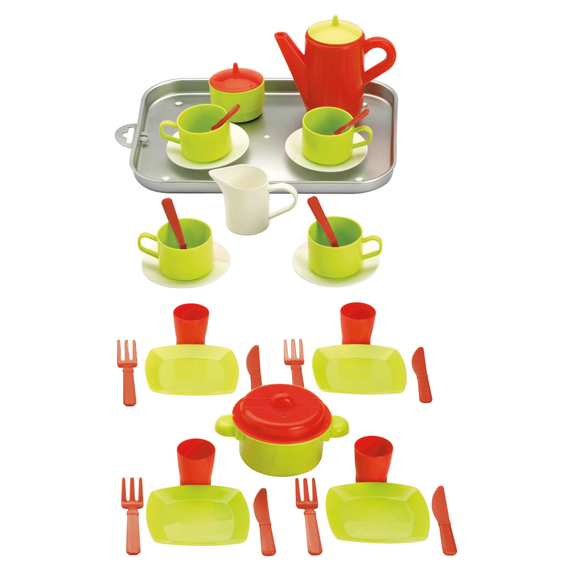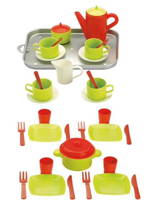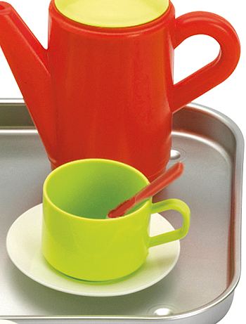 Um conjunto completo para brincar às casinhas. - Inclui 4 taças, 4 pires, 4 colheres, 4 garfos, 4 facas, 4 pratos, 1 tabuleiro, 1 panela, 1 cafeteira, 1 jarro de leite, 1 açucareiro - Em plástico - Dimensões do tabuleiro: cerca de 28 x 20 cm - Fabricado em França