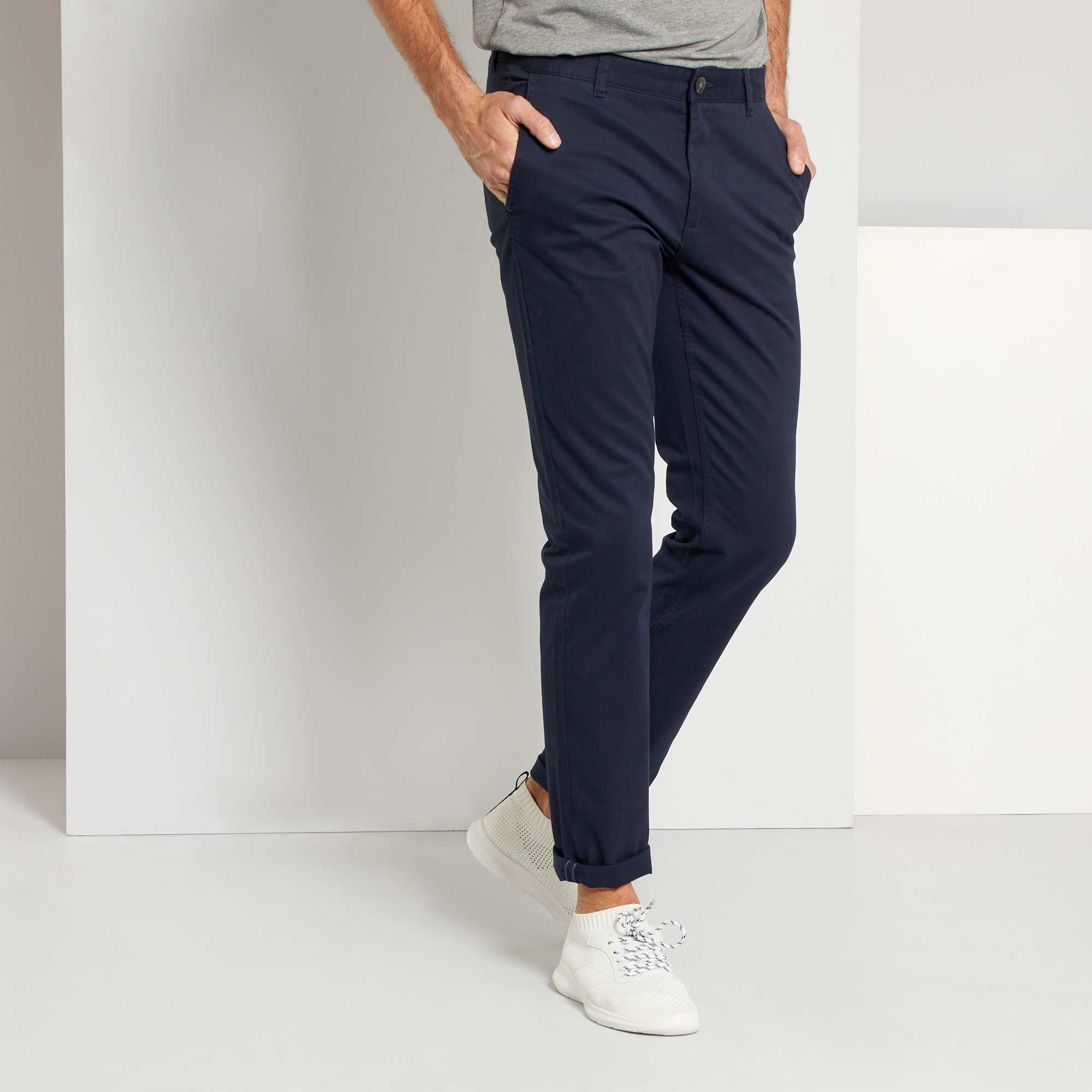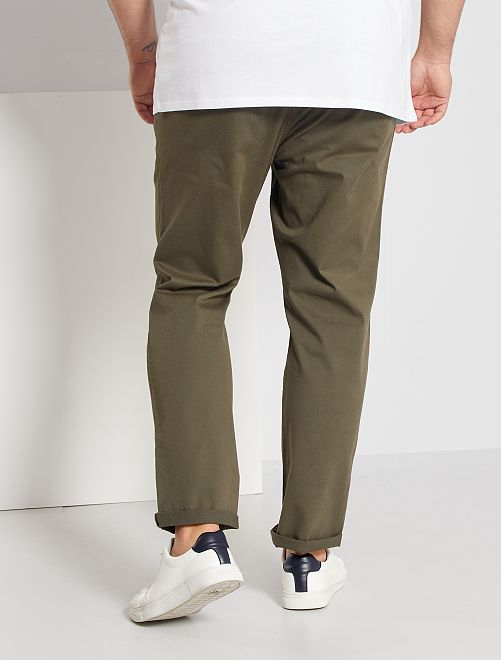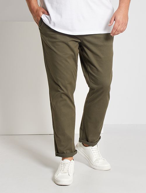 Para os que são um pouco maiores do que a média, a Kiabi criou uma linha de vestuário especialmente adaptada à sua morfologia. As indispensáveis calças chino apresentadas com um corte slim e numa bela sarja de algodão elástico ultra confortável. Usar enroladas para um look smart casual espetacular!