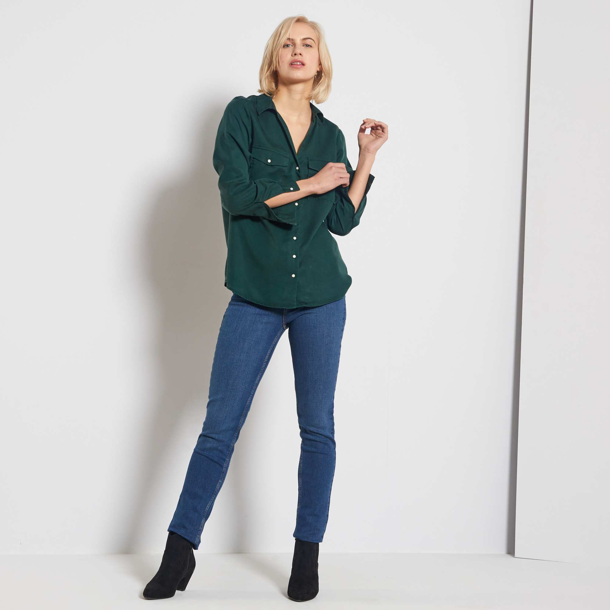- Calças de ganga slim com cintura subida com comprimento US34 (para pessoas que medem entre 1,76 m e 1,80 m)