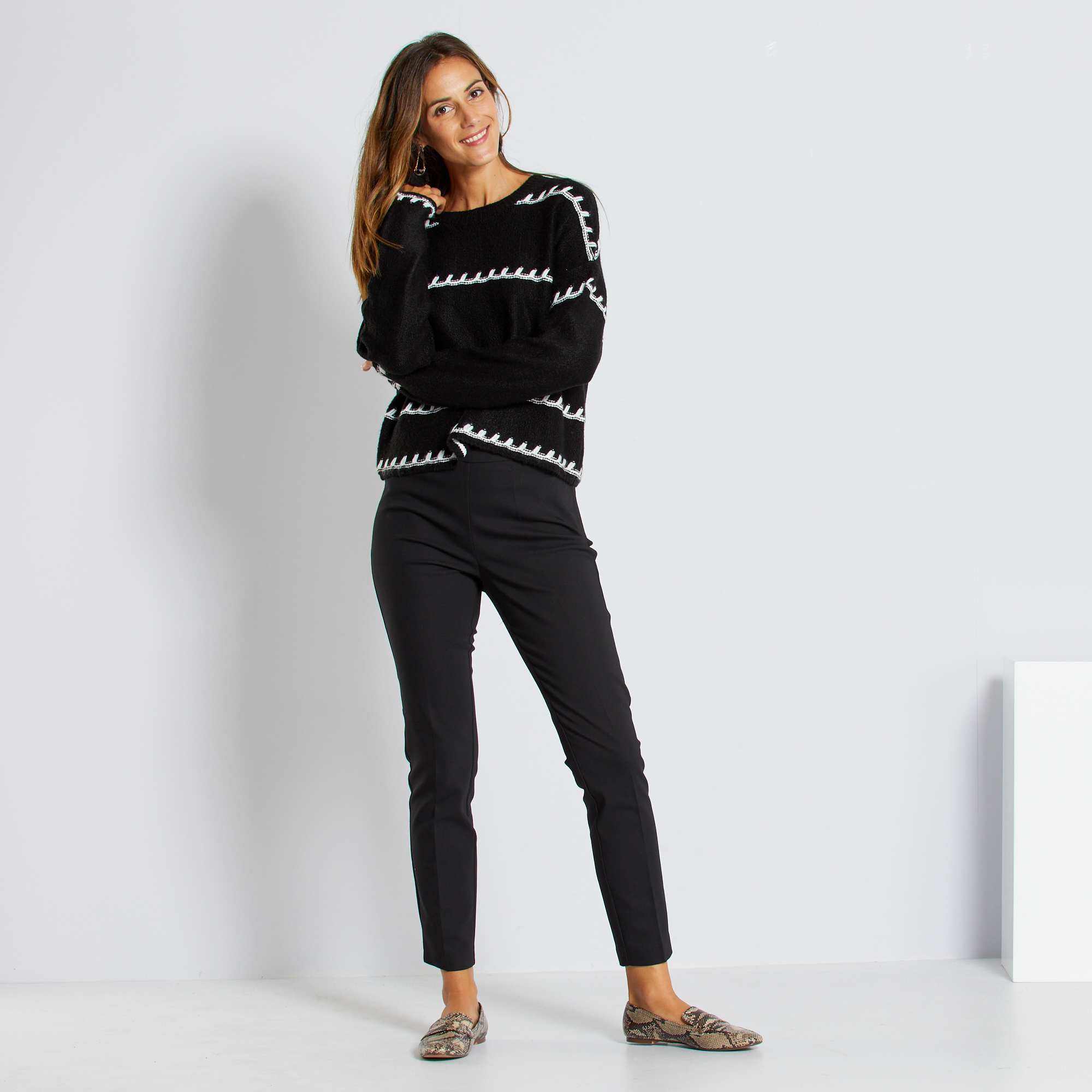 Cintura subida e pernas afuniladas com estas calças!