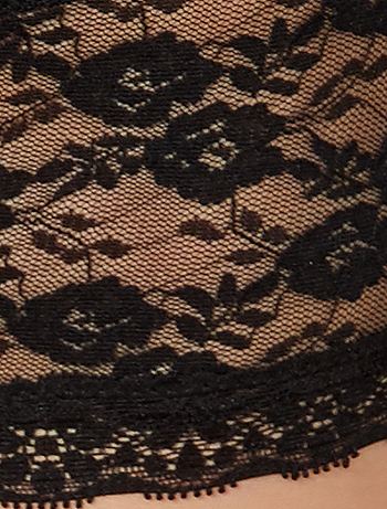 - Costuras em renda tom sobre tom que orlam as coxas