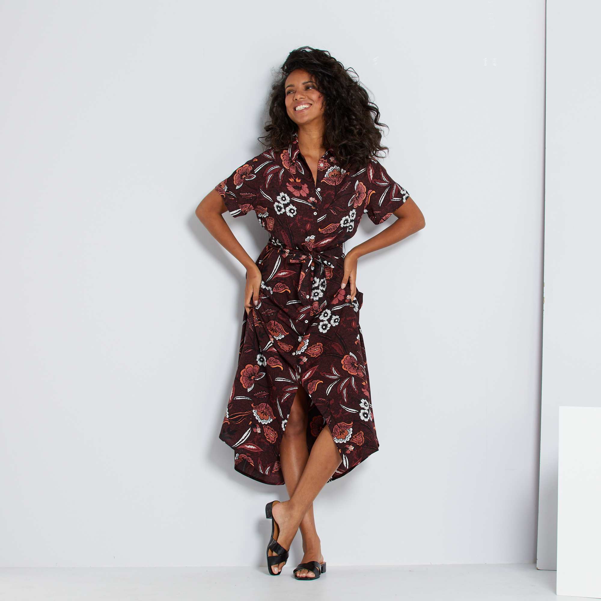 Um estampado de inspiração wax para este vestido-camisa comprido que sublinha de forma bonita a cintura e lhe dá uma silhueta comprida.