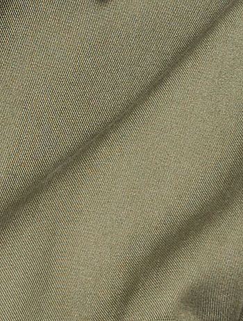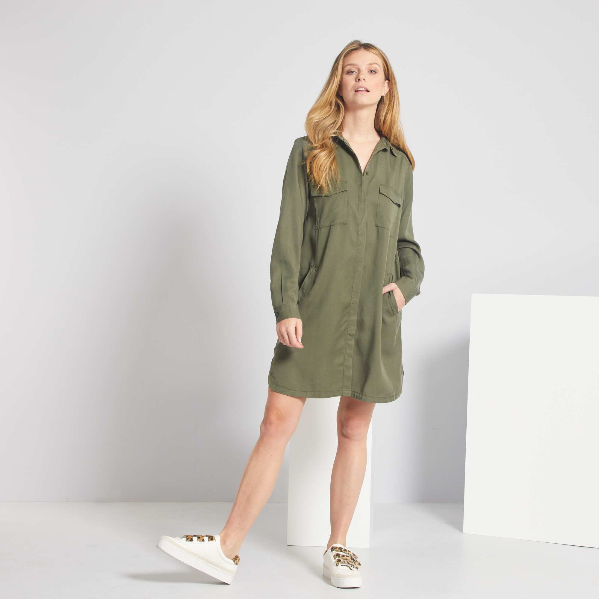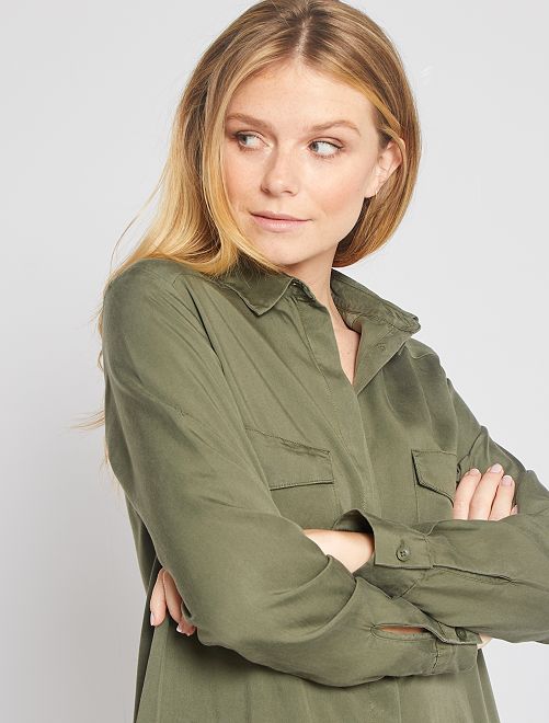 A suavidade e fluidez do Lyocell neste pequeno vestido. Fio proveniente da polpa de madeira transformada graças a um solvente não tóxico reciclado e reciclável infinitamente.