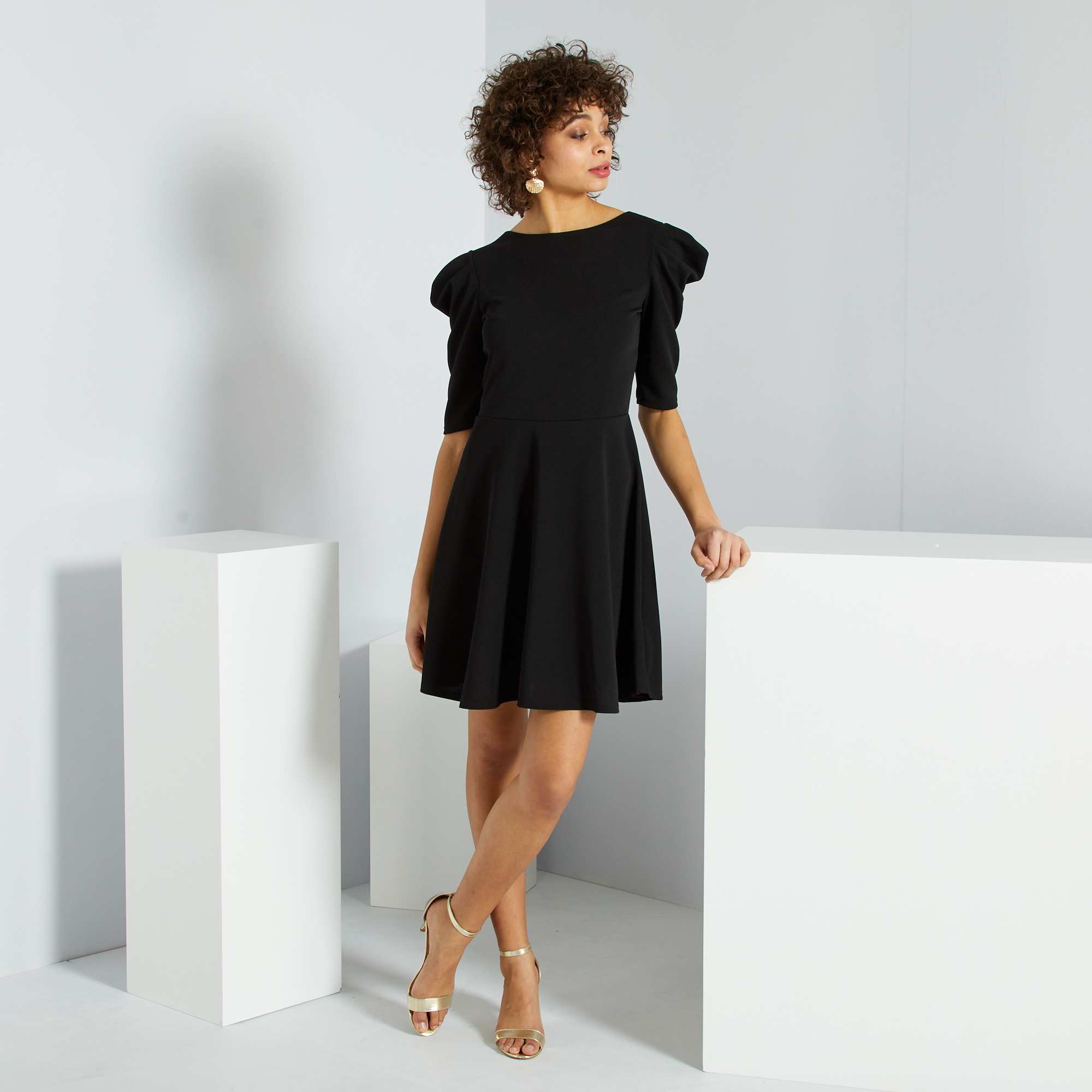 O vestidinho preto também adota também a grande tendência das mangas em balão.